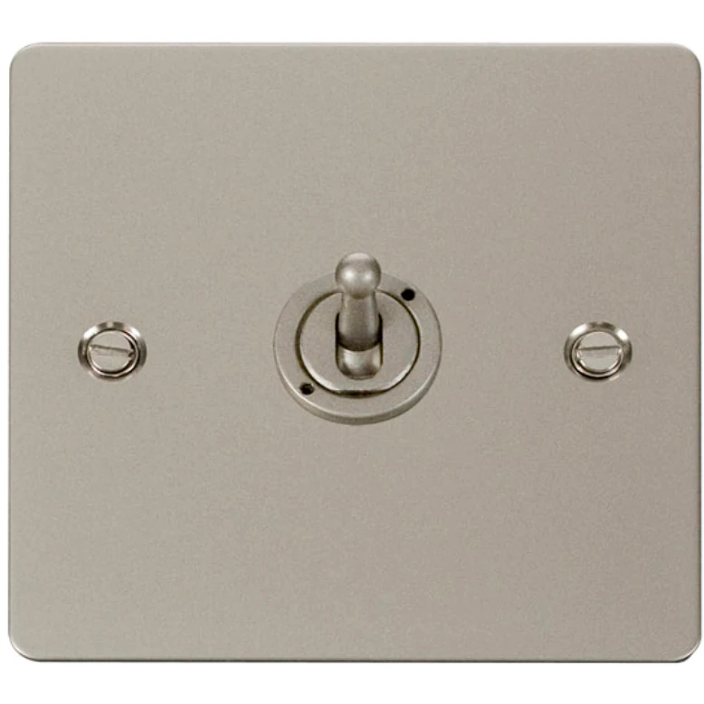 FPPN421 10A Pearl nickel Toggle Switch, 1 Gang 2 Way · · · Load Rating 10AX (Suitable for Inductive Loads) · · Pearl nickel · · Front Plate: Stainless Steel Switch Front & Nut: Cast Zinc Rear Housing: Nylon Terminals: Brass Terminal Screws: Steel & Yellow Passivated Contacts: Silver “on-lay Copper / Brass Internal Busbars: Formed Pressed Brass Earth Strap: Mild Steel · · Plate Fixing Centres 60.3mm · · Back Box Depth 35mm Minimum · · Terminal Capacity 4 x 1.5mm2 or 2 x 2.5mm2 · · IP20 · · 10 year warranty · · BS EN 60669-1:1999 +A1:2002 +A2:2008