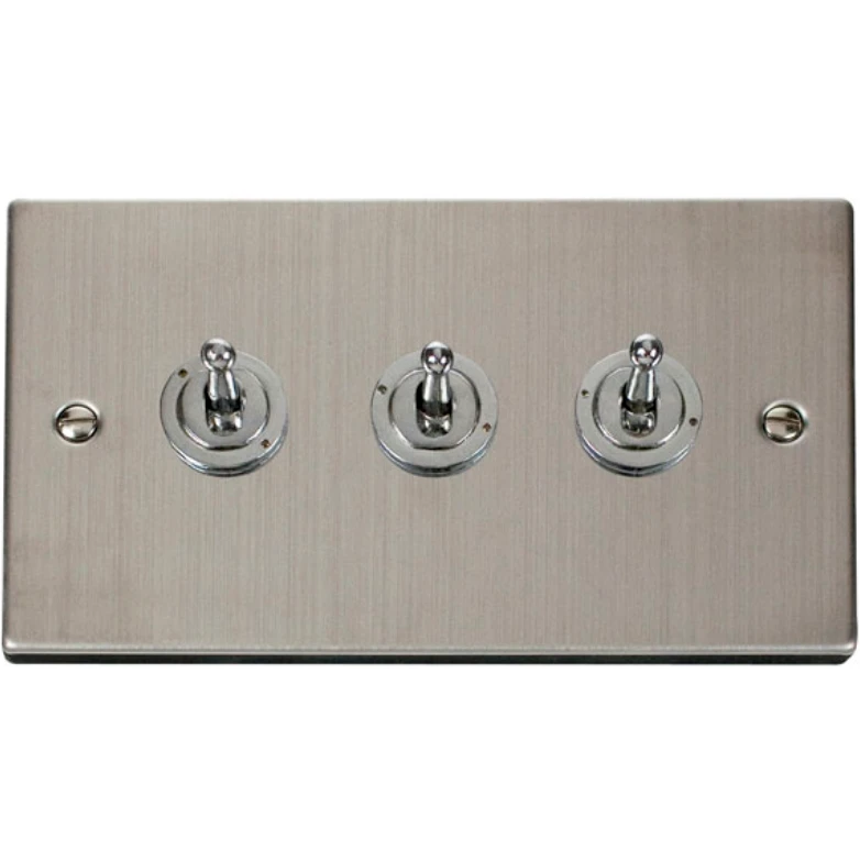 Click Deco VPSS423 Victorian Stainless Steel 3 Gang 2 Way 10AX Toggle Switch. Click Deco Stainless Steel Range. A comprehensive range of decorative metal wiring accessories. The Deco Brand is synonymous with high specification, high quality, long life and unprecedented value for money. In addition the Deco range features the same modular switch design which is compatiable with Mini-Grid modules however this is for switches only. With the ever increasing demand for power supplies in all areas of the home comes the problem of selecting and fitting outlets which blend harmoniously with the decor of the room in which they are fitted. The Click Deco range has it covered with 9 different finishes to choose from. · · · Stainless Steel Finish · · 3 Gang 2 Way Toggle Light Switch · · Suitable for 25mm back box · · Decorative Metal Finish · · Ingress Protection IP20 · · 10AX (Suitable for Inductive Loads)
