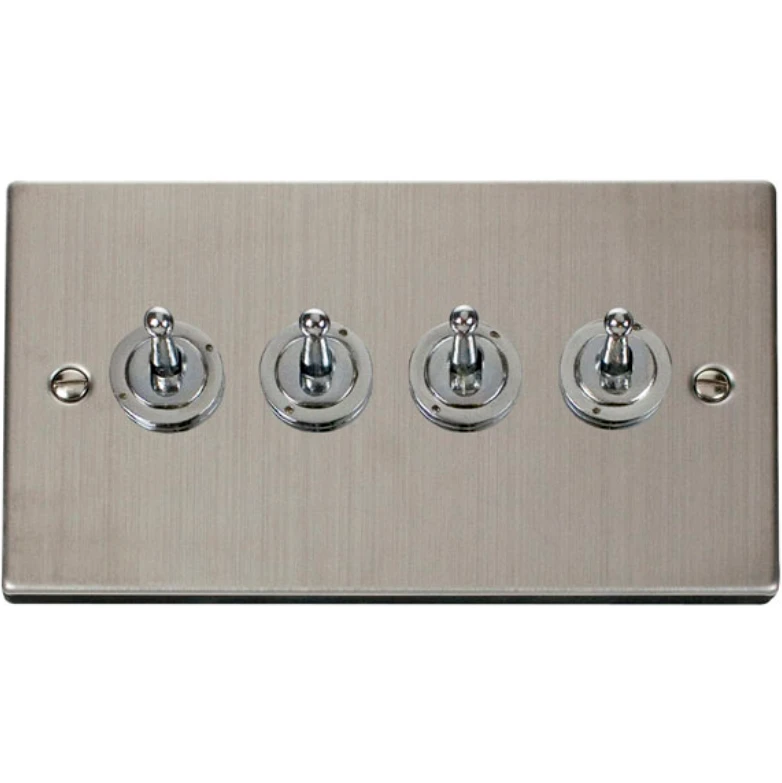 Click Scolmore Toggle Switch 4 Gang 2 Way 10A Stainless Steel Black&White Gasket