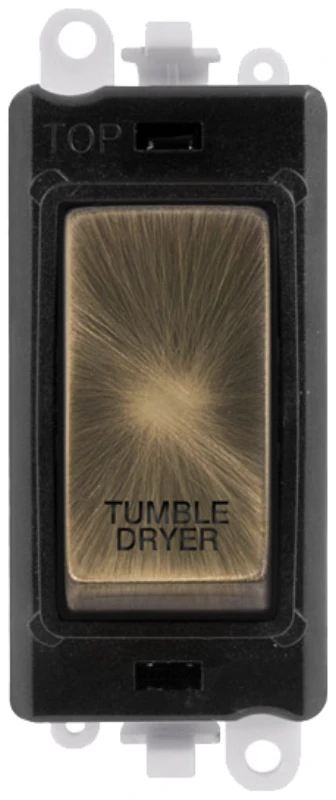 Gridpro tumble dryer laser etched legend black frame 20AX antique brass double pole switch module. · · · Dimensions 24.5mm (W) x 50mm (H) x 22.5mm (D) · · Aperture Dimensions 20mm (W) x 35mm (H) · · Module Frame Finish Black · · Switch Finish Antique Brass · · Laser Etched Legend Tumble Dryer · · Body & Insert: Nylon · · Maximum Voltage 250V 50Hz · · Load Rating 20AX (Suitable For Inductive Loads) · · Terminal Size 5mm · · Termination Type Screw