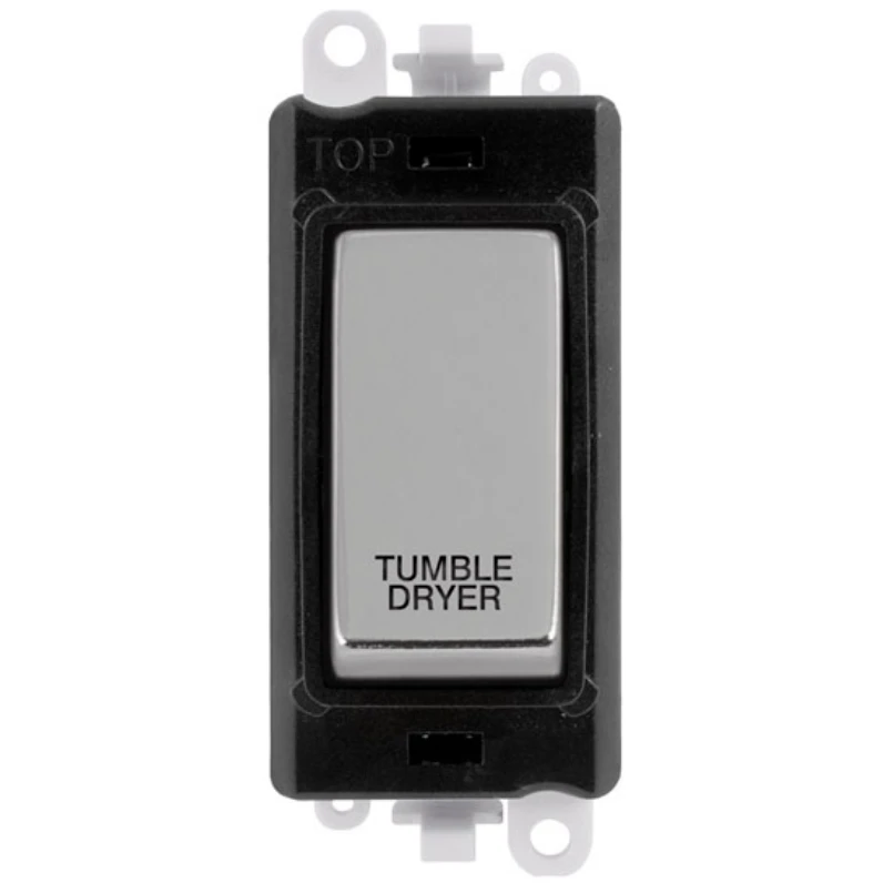 Gridpro tumble dryer laser etched legend black frame 20AX polished chrome double pole switch module. · · · Dimensions 24.5mm (W) x 50mm (H) x 22.5mm (D) · · Aperture Dimensions 20mm (W) x 35mm (H) · · Module Frame Finish Black · · Switch Finish Polished Chrome · · Laser Etched Legend Tumble Dryer · · Body & Insert: Nylon · · Maximum Voltage 250V 50Hz · · Load Rating 20AX (Suitable For Inductive Loads) · · Terminal Size 5mm · · Termination Type Screw
