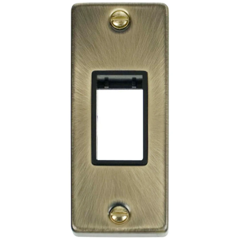 Deco victorian antique brass 1 gang minigrid unfurnished architrave plate 1 aperture. · · · Plate Dimensions (mm) 35 (W) x 89 (H) x 8 (D) · · Dimensions With Gasket (mm) 38 (W) x 92 (H) x 9 (D) · · Plate Fixing Centres – Horizontal (mm) 74 · · Style Victorian · · Finish Antique Brass · · Insert Colour Black · · Gasket Colour Black · · Front Plate: Stainless Steel · · Anti Microbial Certified No · · Termination Type Screw