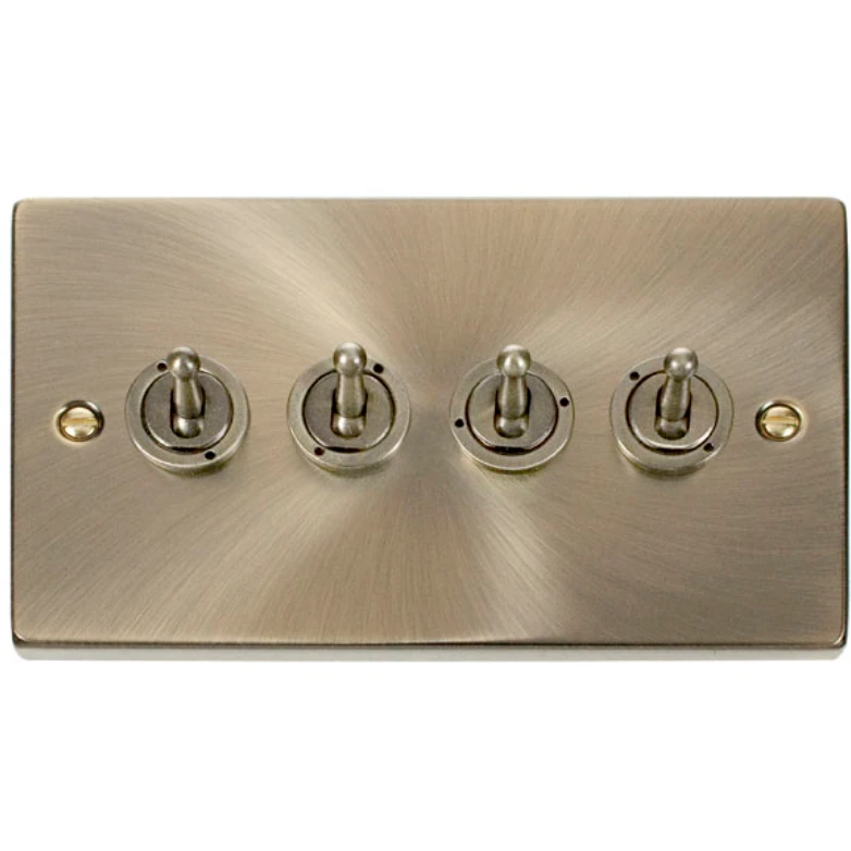 Deco victorian antique brass 10AX 4 gang 2 way toggle plate switch black gasket. · · · Dimensions 146mm (W) x 88mm (H) x 8mm (D) · · Dimensions With Gasket 149mm (W) x 91mm (H) x 9mm (D) · · Plate Design & Finish Victorian Antique Brass · · Gasket Colour Black · · Switch Finish Antique Brass · · Front Plate: Stainless Steel · · Switch Front & Nut: Cast Zinc · · Maximum Voltage 250V 50Hz · · Load Rating 10AX (Suitable for Inductive Loads) · · Plate Fixing Centres 120.6mm