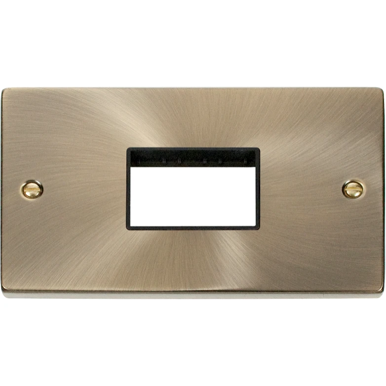 Deco victorian antique brass 2 gang minigrid unfurnished plate 3 apertures black insert. · · · Dimensions 146mm (W) x 88mm (H) x 8mm (D) · · Dimensions With Gasket 149mm (W) x 91mm (H) x 9mm (D) · · Plate Design & Finish Victorian Antique Brass · · Insert & Gasket Colour Black · · Plate Fixing Centres 120.6mm · · Ingress Protection IP20 · · Operational Temperature -5C to +40C · · Warranty 10 Years · · Ensure that the mains supply is isolated before commencing installation and refer to the circuit diagram with the relevant product · · Bare earth cables must always be covered with appropriate sleeving and wired to the earth terminal