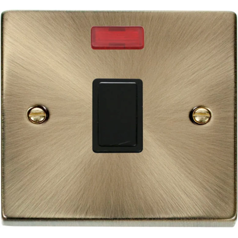 Deco victorian antique brass black insert 20A double pole plate switch with neon. · · · Dimensions 88mm (W) x 88mm (H) x 8mm (D) · · Plate Design & Finish Victorian Antique Brass · · Insert & Gasket Colour Black · · Front Plate: Stainless Steel · · Insert, Switch & Rear Housing: Urea · · Maximum Voltage 250V 50Hz · · Load Rating 20A · · Plate Fixing Centres 60.3mm · · Terminal Size 5mm · · Terminal Torque 1.8Nm