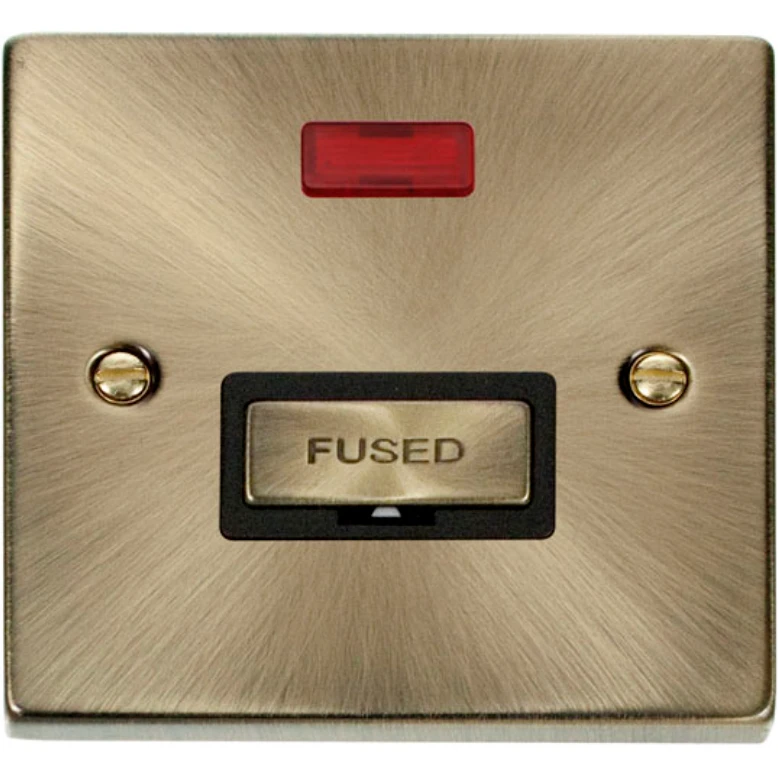 Deco victorian antique brass black insert 13A ingot fused connection unit with neon. · · · Dimensions 88mm (W) x 88mm (H) x 8mm (D) · · Plate Design & Finish Victorian Antique Brass · · Insert & Gasket Colour Black · · Front Plate: Stainless Steel · · Insert & Housing: Urea · · Maximum Voltage 250V 50Hz · · Load Rating 13A · · Plate Fixing Centres 60.3mm · · Terminal Size 5mm · · Terminal Torque 2.5Nm