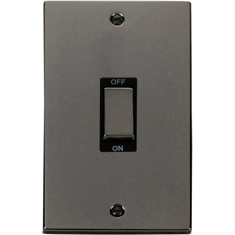 Deco victorian black nickel black insert 45A ingot 2 gang (vertica) double pole plate switch. · · · Dimensions 88mm (W) x 146mm (H) x 8mm (D) · · Plate Design & Finish Victorian Black Nickel · · Insert & Gasket Colour Black · · Front Plate: Stainless Steel · · Insert & Rear Housing: Urea · · Maximum Voltage 250V 50Hz · · Load Rating 45A · · Plate Fixing Centres 120.6mm (Vertical Fixing) · · Terminal Size 6mm · · Terminal Torque 2.5Nm