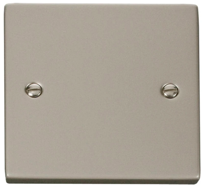 Deco victorian pearl nickel 1 gang blank plate. · · · Dimensions 88mm (W) x 88mm (H) x 8mm (D) · · Plate Design & Finish Victorian Pearl Nickel · · Front Plate: Stainless Steel · · Terminals: Brass · · Terminal Screws: Steel & Yellow Passivated · · Plate Fixing Centres 60.3mm · · Ingress Protection IP20 · · Back Box Depth 16mm Minimum · · Operational Temperature -5°C to +40°C · · Warranty 10 Years