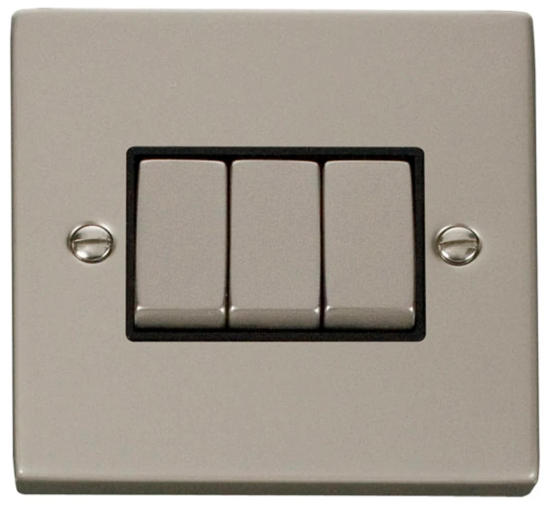 Deco victorian pearl nickel black insert 10AX ingot 3 gang 2 way plate switch. · · · Dimensions 88mm (W) x 88mm (H) x 8mm (D) · · Plate Design & Finish Victorian Pearl Nickel · · Insert & Gasket Colour Black · · Front Plate: Stainless Steel · · Insert: Urea · · Maximum Voltage 250V 50Hz · · Load Rating 10AX (Suitable for Inductive Loads) · · Plate Fixing Centres 60.3mm · · Terminal Size 3.5mm · · Terminal Torque 0.5Nm