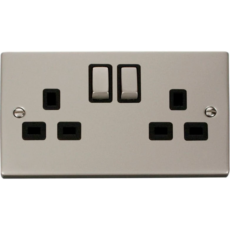 Deco victorian pearl nickel black insert 13A ingot 2 gang double pole switched socket outlet. · · · Dimensions 146mm (W) x 88mm (H) x 8mm (D) · · Plate Design & Finish Victorian Pearl Nickel · · Insert & Gasket Colour Black · · Front Plate: Stainless Steel · · Insert & Housing: Urea · · Switch Cover: Stainless Steel · · Terminals: Brass · · Terminal Screws: Steel & Yellow Passivated · · Maximum Voltage 250V 50Hz · · Load Rating 13A