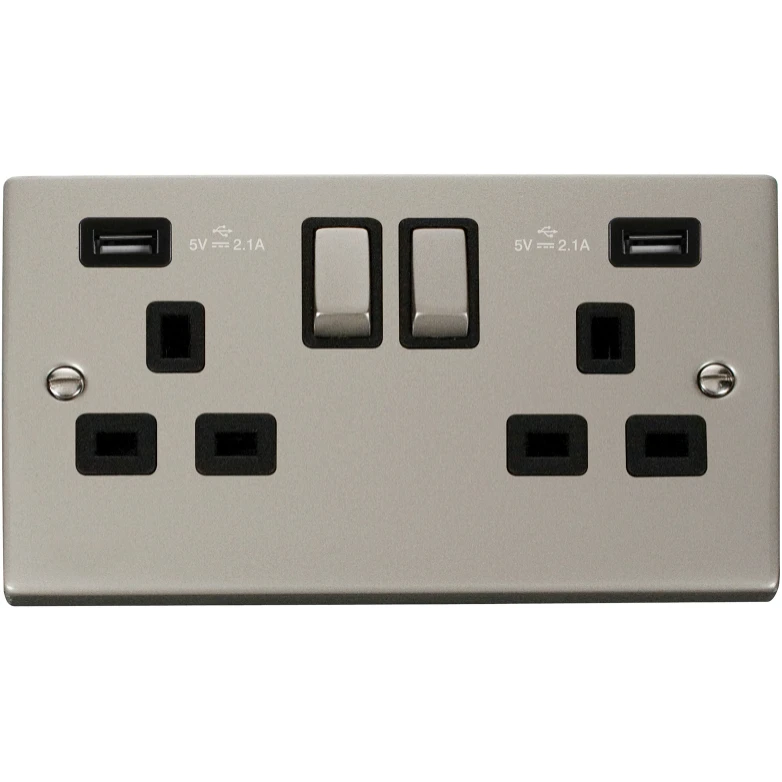 Deco victorian pearl nickel black insert 13A ingot 2 gang switched socket outlet with twin USB (total 4.2A) outlets. · · · Dimensions 146mm (W) x 88mm (H) x 8mm (D) · · Plate Fixing Centres – Horizontal (mm) 120.6 · · Style Victorian · · Finish Pearl Nickel · · Insert Colour Black · · Gasket Colour Black · · Front Plate: Stainless Steel · · Insert: Urea · · Anti Microbial Certified No · · Rated Voltage (V) (Ue) 250
