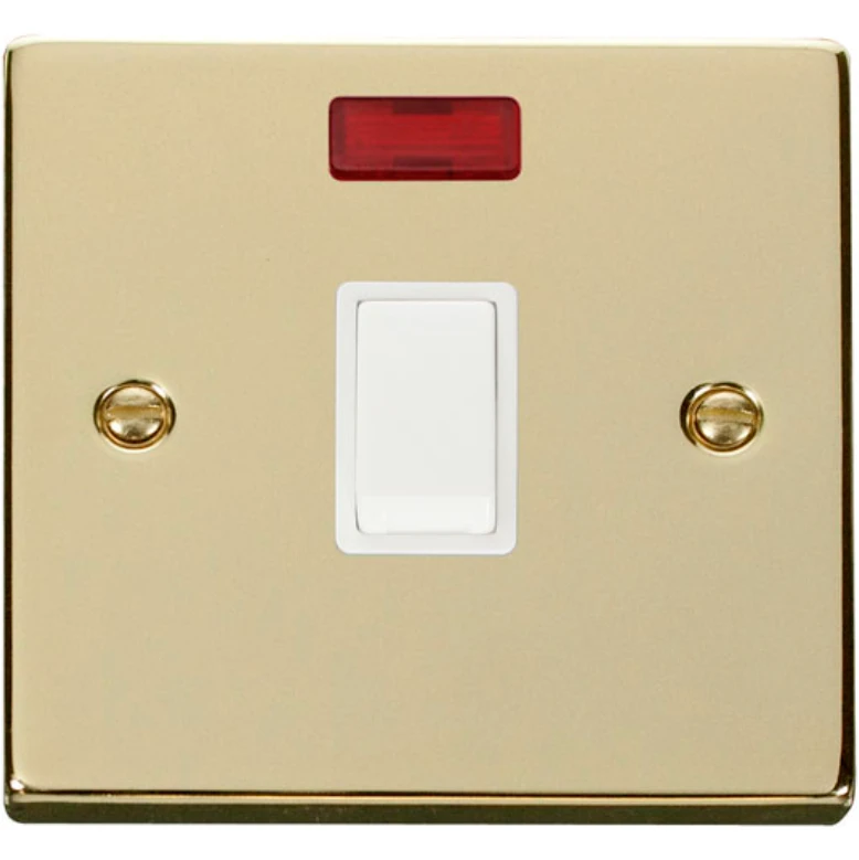Deco victorian polished brass white insert 20A double pole plate switch with neon. · · · Dimensions 88mm (W) x 88mm (H) x 8mm (D) · · Plate Design & Finish Victorian Polished Brass · · Insert & Gasket Colour White · · Front Plate: Stainless Steel · · Insert, Switch & Rear Housing: Urea · · Maximum Voltage 250V 50Hz · · Load Rating 20A · · Plate Fixing Centres 60.3mm · · Terminal Size 5mm · · Terminal Torque 1.8Nm