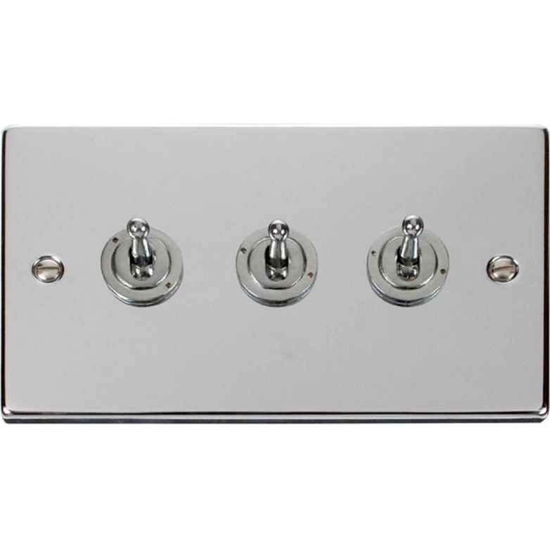 Deco victorian polished chrome 10AX 3 gang 2 way toggle plate switch. · · · Dimensions 146mm (W) x 88mm (H) x 8mm (D) · · Plate Design & Finish Victorian Polished Chrome · · Switch Finish Polished Chrome · · Front Plate: Stainless Steel · · Switch Front & Nut: Cast Zinc · · Maximum Voltage 250V 50Hz · · Load Rating 10AX (Suitable for Inductive Loads) · · Plate Fixing Centres 120.6mm · · Terminal Size 4.9mm x 4.1mm · · Terminal Torque 1.2Nm
