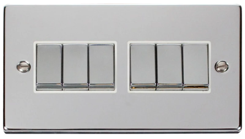 Deco victorian polished chrome white insert 10AX ingot 6 gang 2 way plate switch. · · · Plate Dimensions (mm) 146 (W) x 88 (H) x 8 (D) · · Plate Design & Finish Victorian Polished Chrome · · Insert & Gasket Colour White · · Front Plate: Stainless Steel · · Insert: Urea · · Maximum Voltage 250V 50Hz · · Load Rating 10AX (Suitable for Inductive Loads) · · Plate Fixing Centres 120.6mm · · Terminal Size 3.5mm · · Terminal Torque 0.5Nm