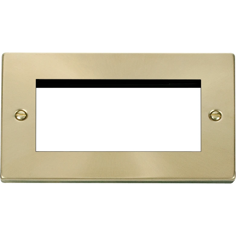 Deco victorian satin brass 2 gang new media unfurnished plate 4 apertures. · · · Dimensions 146mm (W) x 88mm (H) x 8mm (D) · · Plate Design & Finish Victorian Satin Brass · · Front Plate: Stainless Steel · · Insert: Nylon · · Earth Strap: Mild Steel · · Plate Fixing Centres 120.6mm · · Ingress Protection IP20 · · Operational Temperature -5C to +40C · · Warranty 10 Years · · Ensure that the mains supply is isolated before commencing installation and refer to the circuit diagram with the relevant product