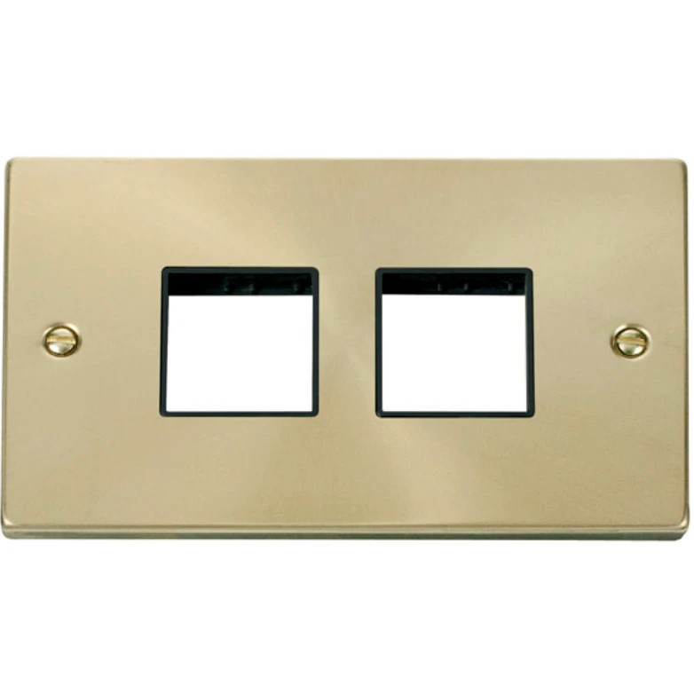 Deco victorian satin brass black insert 2 gang minigrid unfurnished plate 2 x 2 apertures. · · · Dimensions 146mm (W) x 88mm (H) x 8mm (D) · · Plate Design & Finish Victorian Satin Brass · · Insert & Gasket Colour Black · · Front Plate: Stainless Steel · · Insert: Urea · · Plate Fixing Centres 120.6mm · · Ingress Protection IP20 · · Operational Temperature -5C to +40C · · Warranty 10 Years · · Ensure that the mains supply is isolated before commencing installation and refer to the circuit diagram with the relevant product