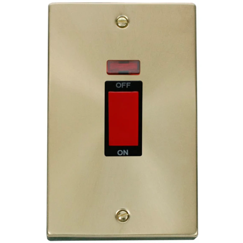 Deco victorian satin brass black insert 45A 2 gang (vertical) double pole plate switch with neon. · · · Dimensions 88mm (W) x 146mm (H) x 8mm (D) · · Plate Design & Finish Victorian Satin Brass · · Insert & Gasket Colour Black · · Front Plate: Stainless Steel · · Insert, Switch & Rear Housing: Urea · · Maximum Voltage 250V 50Hz · · Load Rating 45A · · Plate Fixing Centres 120.6mm (Vertical Fixing) · · Terminal Size 6mm · · Terminal Torque 2.5Nm