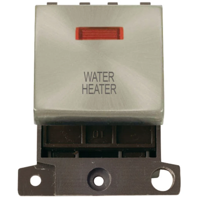 Minigrid water heater satin chrome 20A double pole switch with neon module. · · · Dimensions 41mm (W) x 52.5mm (H) x 22mm (D) · · Aperture Dimensions 32mm (W) x 31.5mm (H) · · Finish Satin Chrome · · Rocker Switch: Urea · · Rear Housing: Nylon · · Maximum Voltage 250V 50Hz · · Load Rating 20A · · Terminal Size 4.4mm · · Terminal Torque 1.2Nm · · Terminal Capacity 4 x 1.5mm