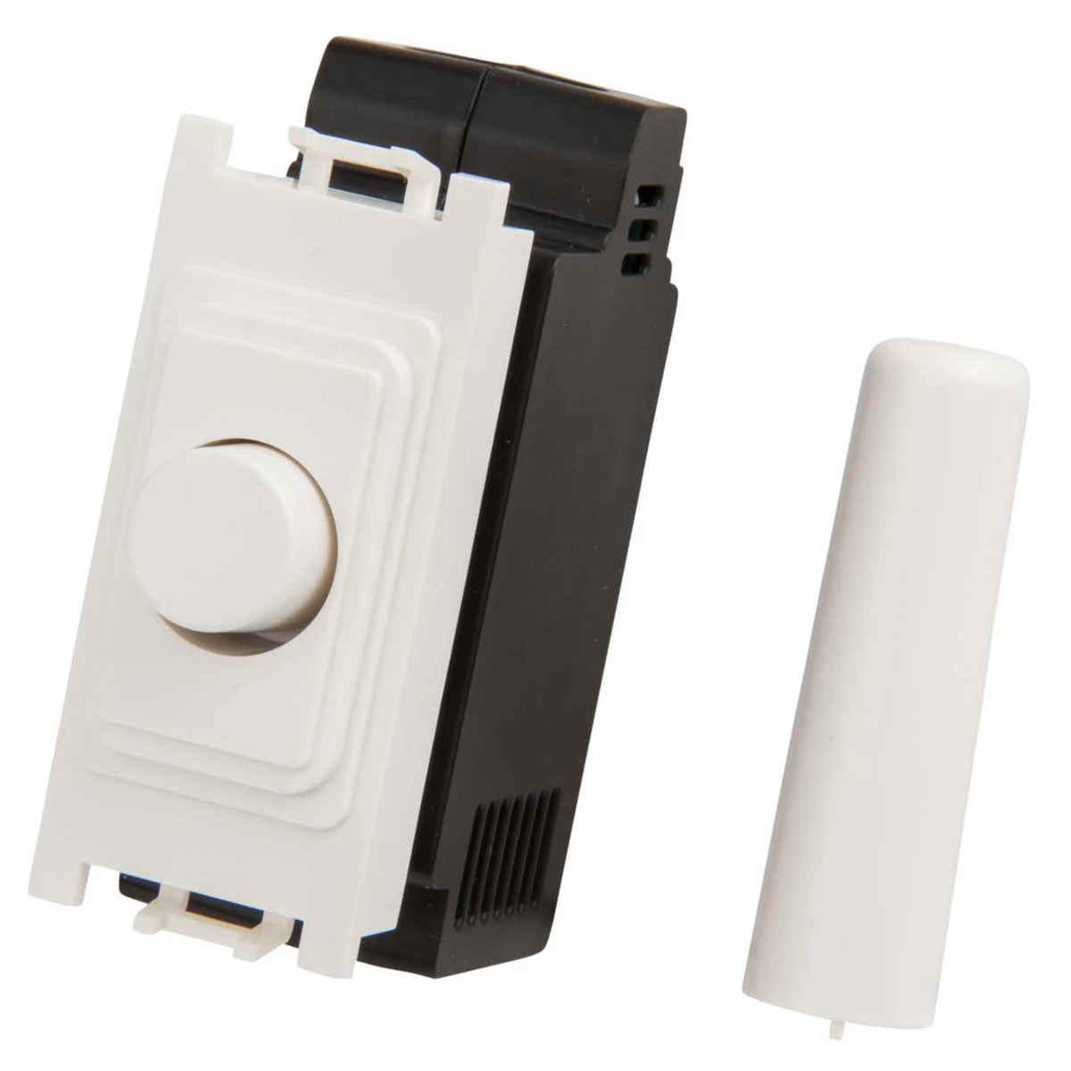 A Mains Grid Dimmer suitable for downlight. It is made of plastic and includes Deta, GET, BG, Wandsworth, MK Logic, Hamilton, MEM and Crabtree grid plate adapters. · · · Compatible with the downlight range · · Minimum brightness can be adjusted · · Minimum depth of pattress box: 35mm · · BS EN 60669-2-1 · · 10 LED units max. · · BS EN 60669-2-1 · · 10 LED units max.