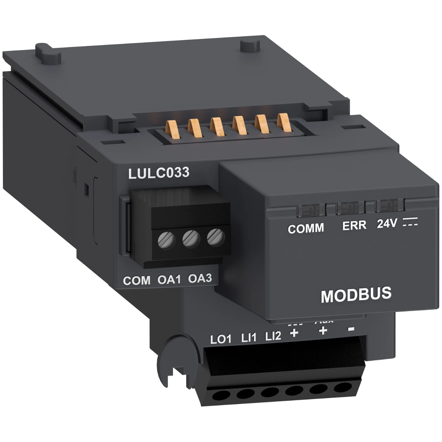 TeSys U communication module for Modbus, to be inserted in advanced power bases LUB120, LUB320, LUB380 equipped with a BL type (24V DC) LUC control unit. It provides a RJ45 connector for connection to a Modbus network, a plug-in terminal block for the connection to an external power supply 24V DC, in addition with 2 x configurable logic inputs 24V DC and 1 x logic output 24V DC. On front side, a 3-point plug-in terminal block is provided for the local control of the starter controller, to be associated with a control terminal block LU9BN11C for a LUB base or LU9MRC for a LU2B base. It displays 3 LEDs indicating 24V voltage presence (24V=) and communication status (COMM, ERR). Certified when used in conjunction with a LUB power base (IEC, UL, CSA, CCC, EAC, Marine), Green Premium compliant (RoHS/REACh). · · · TeSys U communication module for Modbus, to be inserted in advanced power bases LUB120, LUB320, LUB380 equipped with a BL type (24V DC) LUC control unit. · · It provides a RJ45 connector for connection to a Modbus network, · · a plug-in terminal block for the connection to an external power supply 24V DC, in addition with 2 x configurable logic inputs 24V DC and 1 x logic output 24V DC. · · On front side, a 3-point plug-in terminal block is provided for the local control of the starter controller, to be associated with a control terminal block LU9BN11C for a LUB base or LU9MRC for a LU2B base. · · It displays 3 LEDs indicating 24V voltage presence (24V=) and communication status (COMM, ERR).