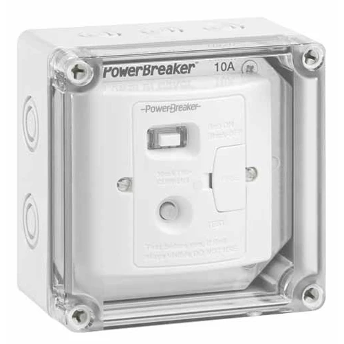 Greenbrook PowerBreaker RCD Spur Unit inside a weatherproof enclosure. This accessory can be used for long term projects in most weather conditions. Substantial clip feature to keep lid shut. IP67 protection rating. Meets BS 1363-4:1995 and BS7288:1990 standards. · · · Clear lid/cover for easy visibility · · Rust-proof hinges · · Easy cable entry · · UV protected – will not deteriorate in sunlight · · Certified by CE