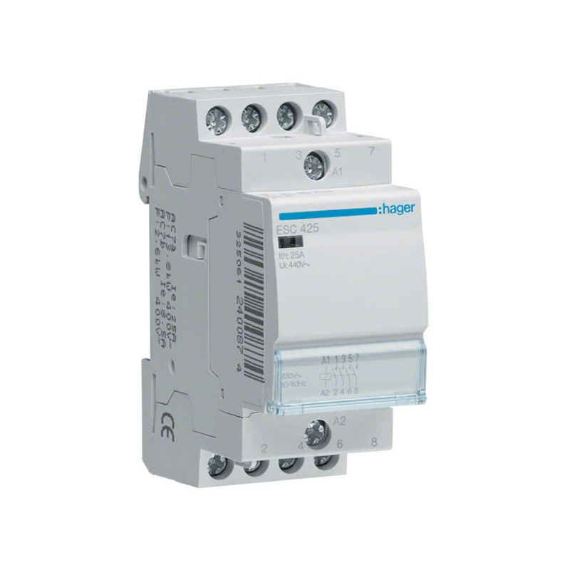 Technical Specifications  Technical Specifications Contactor for distribution board installation Voltage type (operating voltage) AC Voltage type (excitation voltage) AC Number of contacts as normally open contact 4 Max. load fluorescent lamp 950 VA Rated operation current 25 A Max. incandescent lamp load 1900 W Rated operating voltage 400 – 400 V Rated excitation voltage 230 – 230 V · Technical Data Sheet – Click to Download