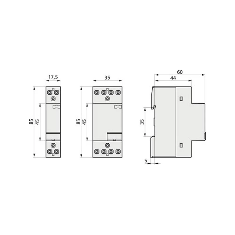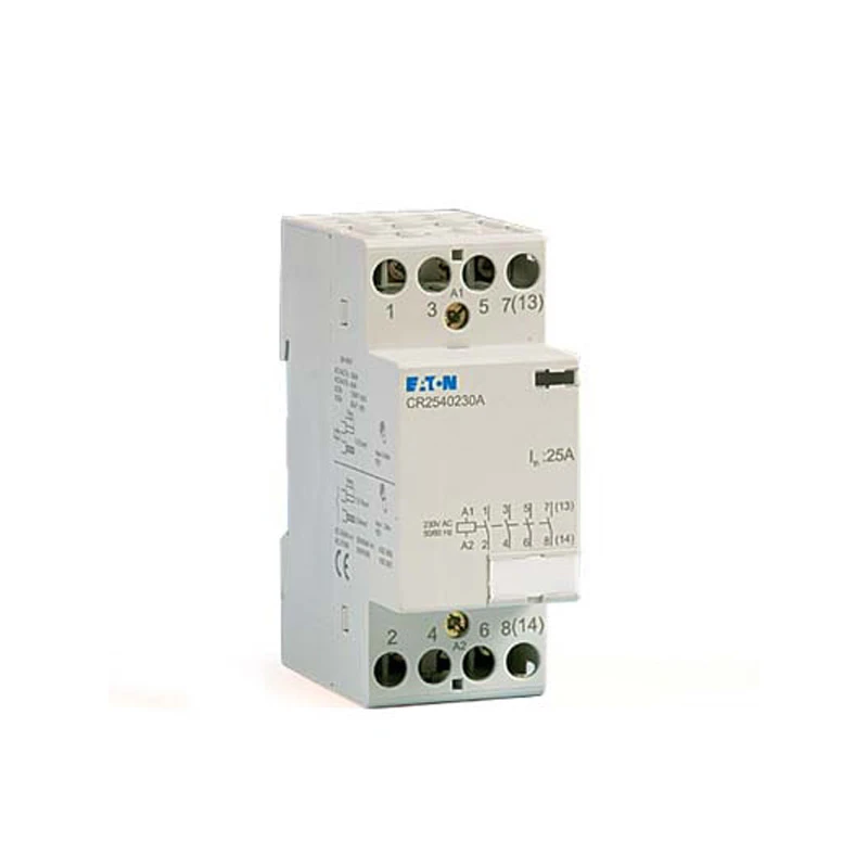 Installation contactor, rated control circuit voltage 230V AC, rated operational current at AC1 25A, function: 4NO, details according to IEC/EN 61095, IEC/EN 60947-4-1, standard front dimension 45 mm, mounting width 2 MU, top-hat rail mounting · · · 4 NO Contacts · · 30 to +80 °C storage temperature range · · IEC 60947-4-1, IEC 61095 standard · · 230V · · 9 KW · · Vibration resistance: 2-4gn (open/closed) · · Certified when used in conjunction with a LUB power base (IEC, UL, CSA, CCC, EAC, Marine), Green Premium compliant (RoHS/REACh). · · IP20/40 Degree of protection · · Ambient temperature: -25°C to 70°C · · RoHS compliant