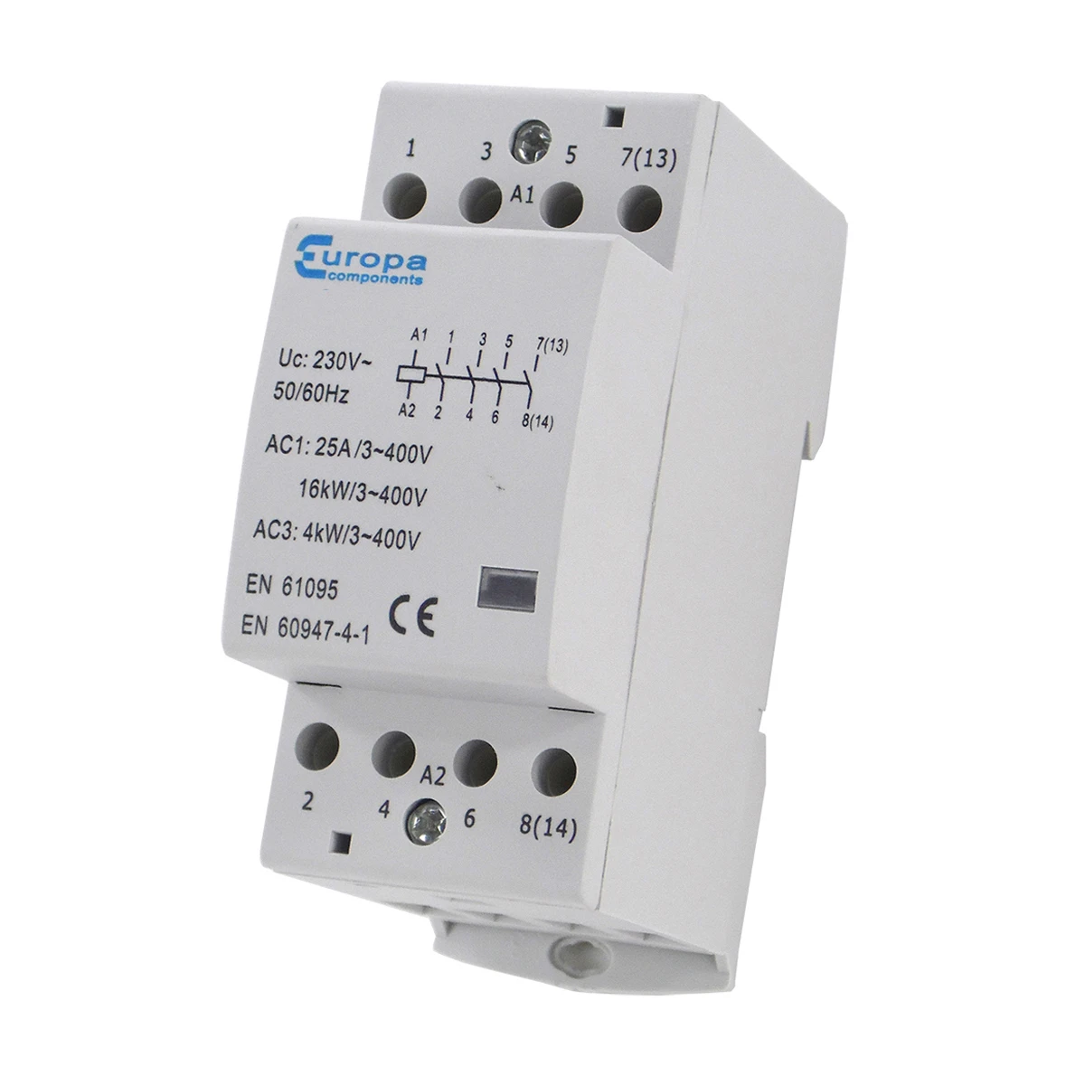 Europa EUC2 Modular Contactor is a DIN rail mounted 2-module four pole 4-normally open modular device. It is designed for installation in consumer units and 3-phase distribution boards. It is ideal for heating lighting and building service type applications. The installation meets the requirements of the IET wiring regulations and is therefore fit for purpose. · · · DIN rail mounting · · Designed for installation in consumer units and 3-phase distribution boards · · Meets the requirements of the IET wiring regulations · · Fit for purpose · · Easy to install (din rail mountable) · · Cost effective