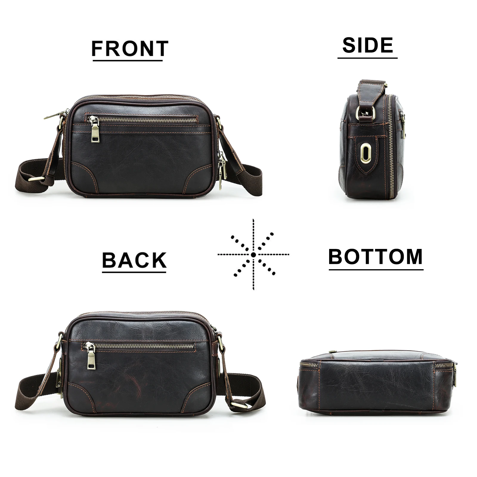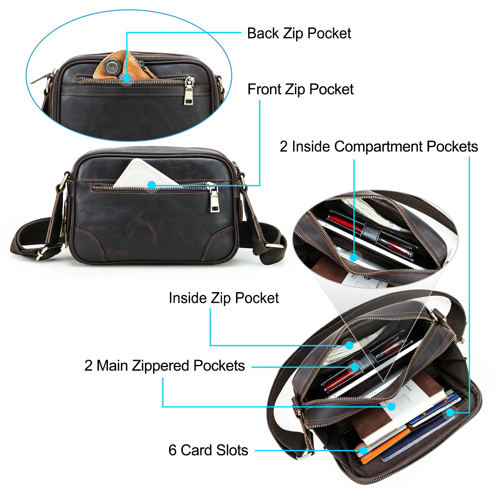 Contact’s Vintage Full Grain Genuine Leather Shoulder Crossbody Bag Men for Spring Summer Multi-Zipper Messenger Bag Expandable