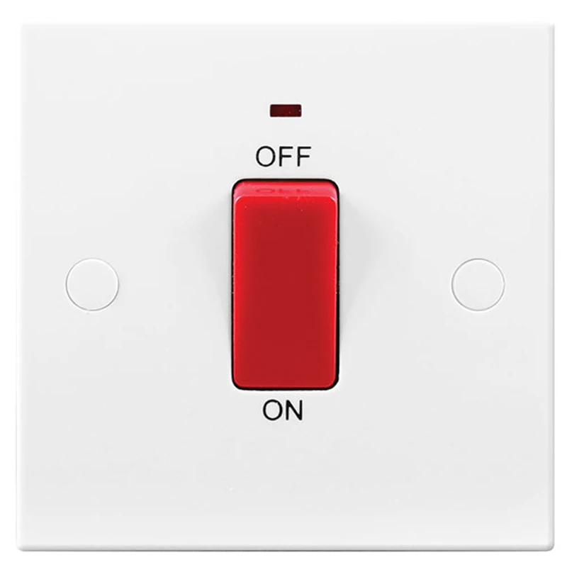 BG Single Plate Control Switch with indicator comes with white moulded round edge, sleek and slim with softly rounded edges covers to conceal fixing screws. The subtle design will blend with any decor suitable for domestic or commercial installation. · · · Double Pole Switches to BS EN 60669-1 · · Minimum mounting box depth 47mm · · Easy to install, supplied with fixing screws and installation instructions · · Angled colour coded terminals with captive screws