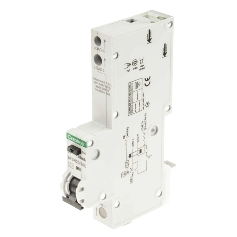 Crabtree Loadstar RCBO is a single pole, 30mA trip current and c-curve. It has 16mm² terminal capacity (outgoing) for consumer unit. · · · Single module, RCBO · · 20A C curve (MCB), 30mA Type A (RCD) · · Single pole · · 16mm² terminal capacity (outgoing) · · 6ka Breaking capacity · · type C curve · · 20A rated