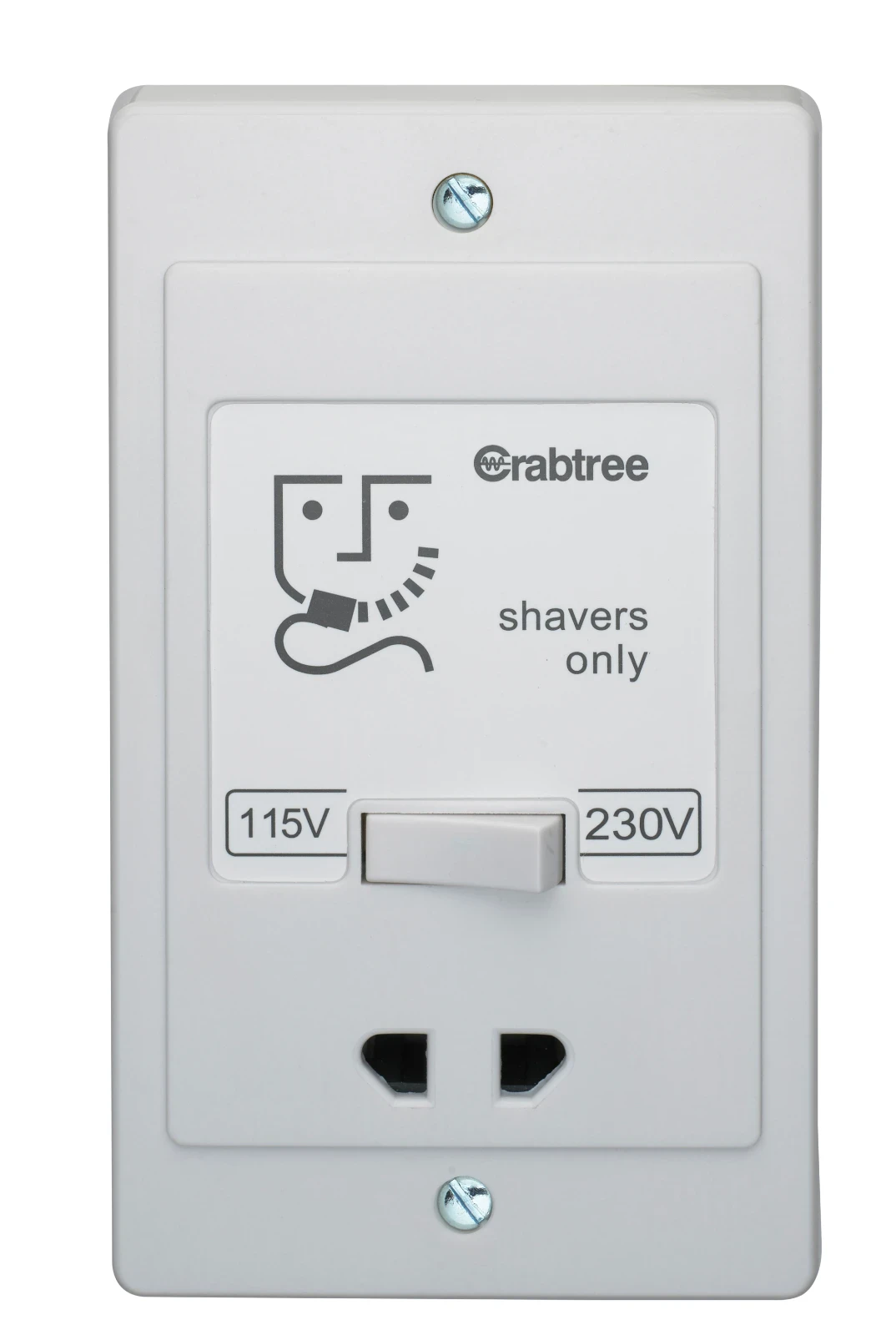 2400 is a white shaver socket, with a switchable output of either 115V or 240V. The recommended flush back box to suit, is an Appleby SB628. Crabtree offer a wide range of wiring accessories, circuit protection and control equipment for the residential, commercial and industrial markets worldwide. The Crabtree Capital range of power and control wiring accessories offers a robust design combined with classic styling. The broad offering means all types of installations can be serviced. · · · Dual Voltage · · Voltage Output Switch