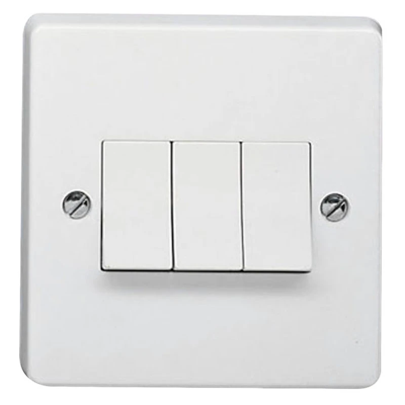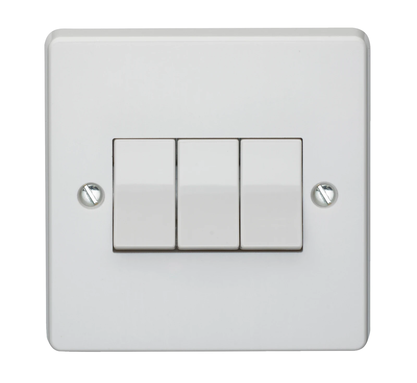 Technical Specifications  Technical Specifications Switch Material Plastic Colour White Minimum depth of back box 16 mm Width of device 86 mm Number of rockers/gangs 3 Height of device 86 mm Switching current for fluorescent lamps 10 AX Rated current 10 A Number of module spaces (modular system) 0 Nominal voltage 250 V With mounting plate Yes Feedback-signal contact No Washing machine switch No Push button switch Yes Halogen free Yes · Technical Data Sheet – Click to Download