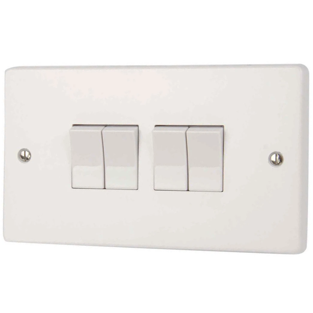 Technical Specifications Technical Specifications Switch Degree of protection (IP rating) IP2X Colour White Surface finish Glossy Material Plastic Width of device 146 mm Height of device 86 mm Switching current for fluorescent lamps 10 AX Number of rockers/gangs 4 Minimum depth of back box 16 mm Number of module spaces (modular system) 0 Nominal voltage 250 V Rated current 10 A Push button switch Yes With mounting plate Yes Halogen free Yes Feedback-signal contact No Washing machine switch No