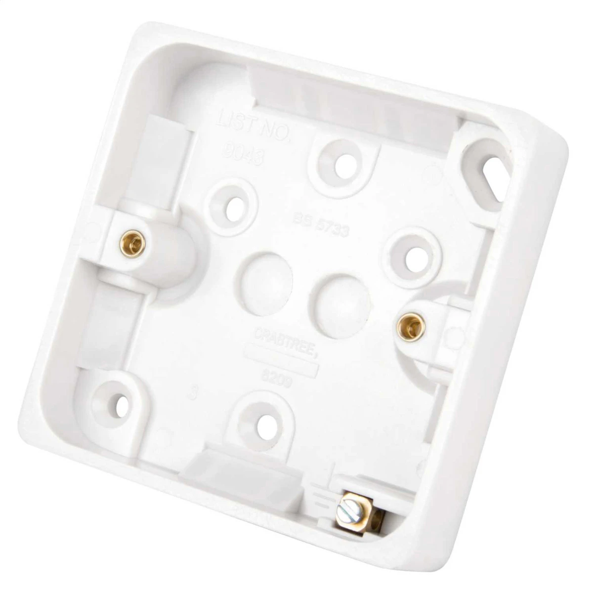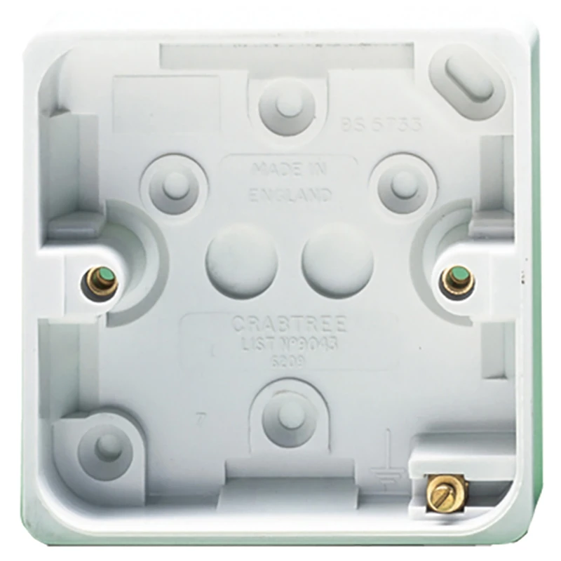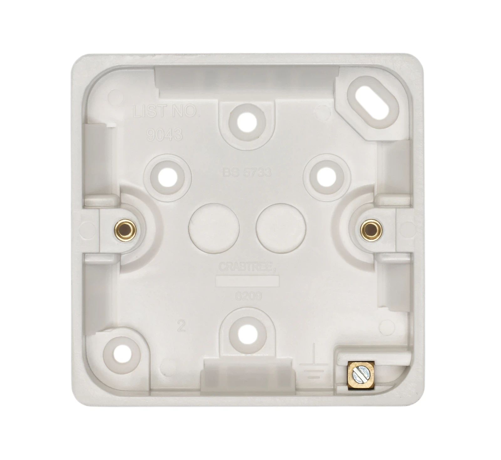 Crabtree 20mm deep surface moulded box with earth terminal is fully design co-ordinated to offer consistent styling and inherent safety features across a broad range of applications. · · · Pattress · · White Plastic