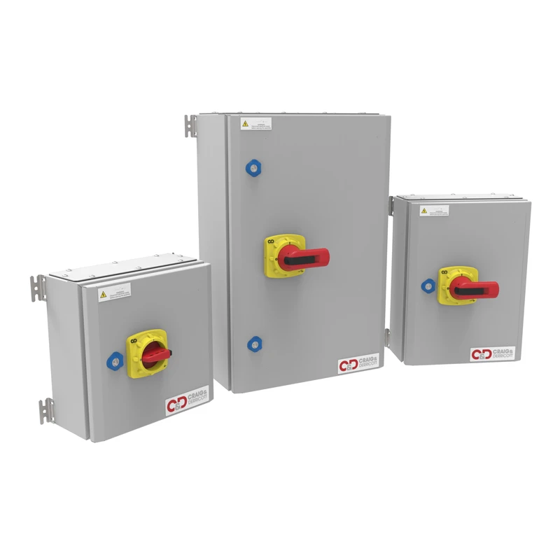 Craig and Derricott i-Switch Switch Disconnector is made of powder coated sheet steel, switches mounted on a removable galvanised chassis plate. Provided with removable top and bottom gland plates. Padlockable handle which allow for the insertion of up to three padlocks in the ‘Off’ position thus preventing the isolator being switched to the ‘On’ position. The door interlock handle can be defeated to enable emergency opening or for testing purposes. · · · Made of powder coated sheet steel · · IP65 protection rating · · Padlockable handle which allows for the insertion of up to three padlocks · · The door interlock handle can be defeated to enable emergency opening or for testing purposes · · Provided with removable top and bottom gland plates