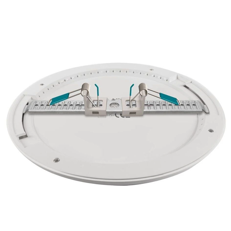 Integrated LED recessed downlight with 14mm slim profile. Features a unique universal fixing that can be adjusted to fit any existing recess from 2.5″ to 8″ diameter. Includes a high quality on-board driver for flicker-free light output. Fitting is suitable surface mounting or recessed installations. Constructed from a white thermal plastic body and polystyrene diffuser for low glare. 30,000 hour life 50,000 switching cycles 120° beam angle 4000K cool white colour temperature Colour rendering index =80 Not suitable for dimming For indoor use only Instant full light 5 year warranty . Cutout Dimension Diameter 2.5″-8″. · · · 30,000 hour life · · 50,000 switching cycles · · 120° beam angle · · 4000K cool white colour temperature · · Colour rendering index =80 · · Not suitable for dimming · · For indoor use only · · Instant full light · · 5 year warranty