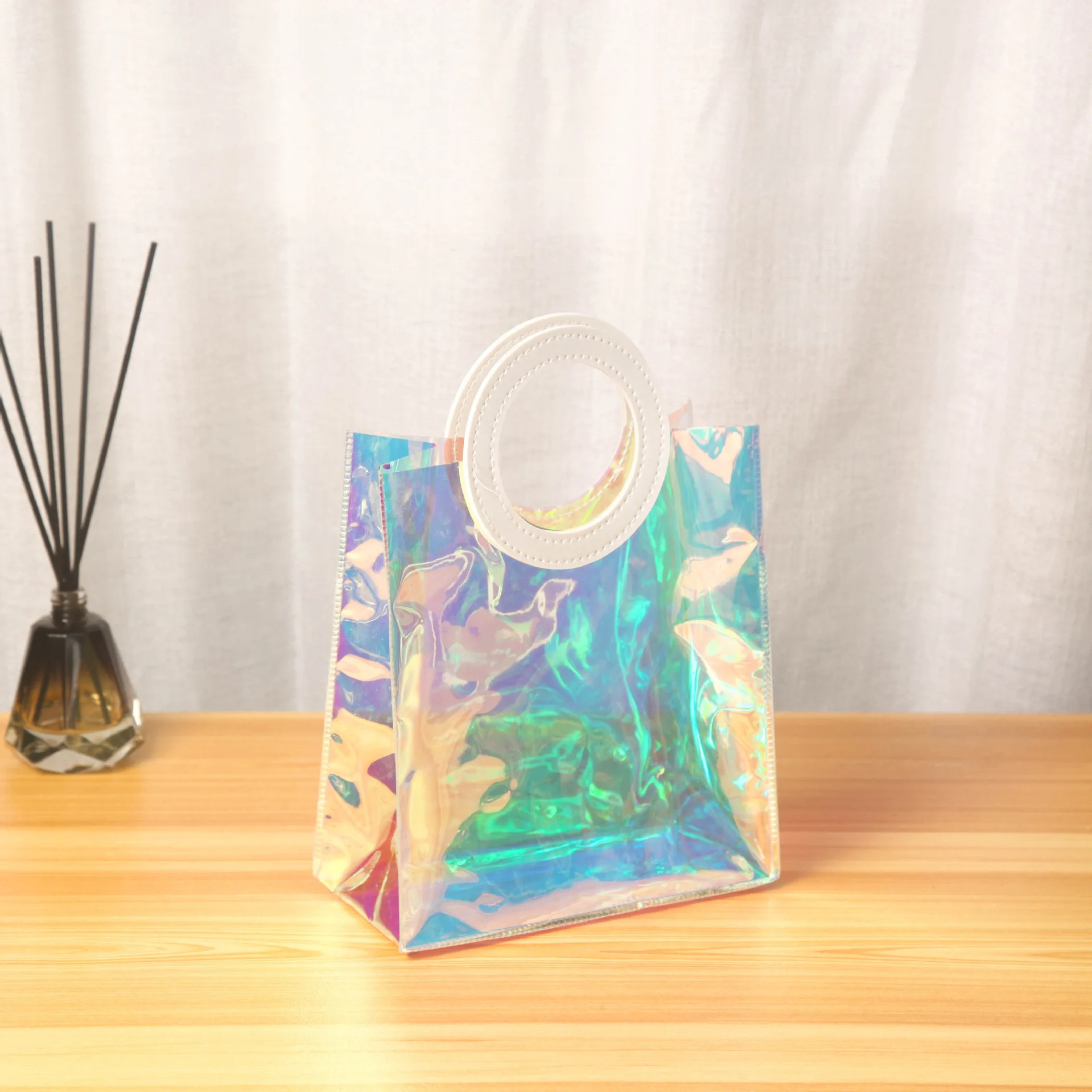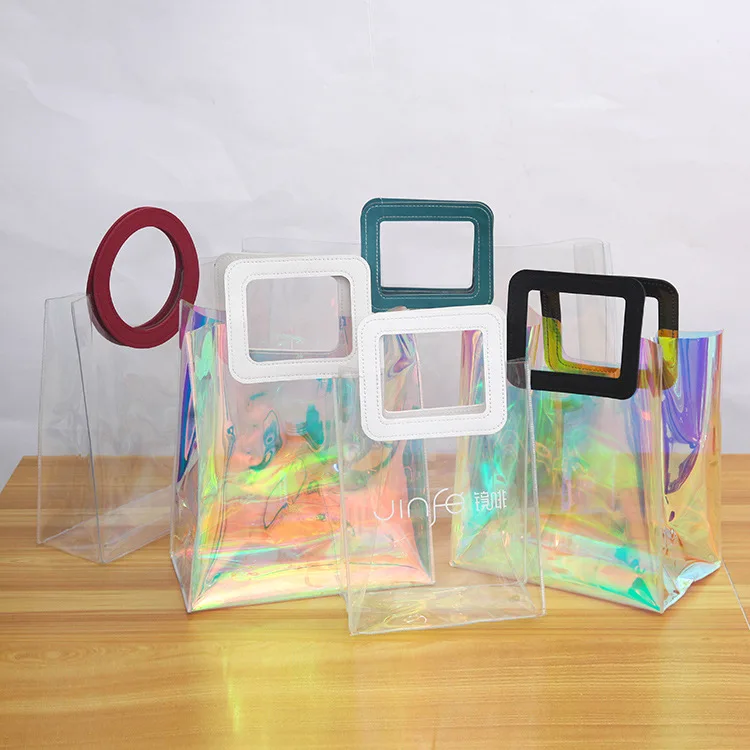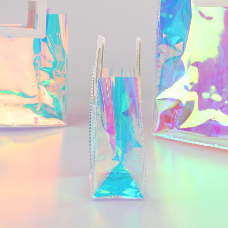 CSMD Chinese Manufacturers Wholesales PVC Material Cheap Price Round Handle Plastic Holographic Tote Bags for Beauties Packaging