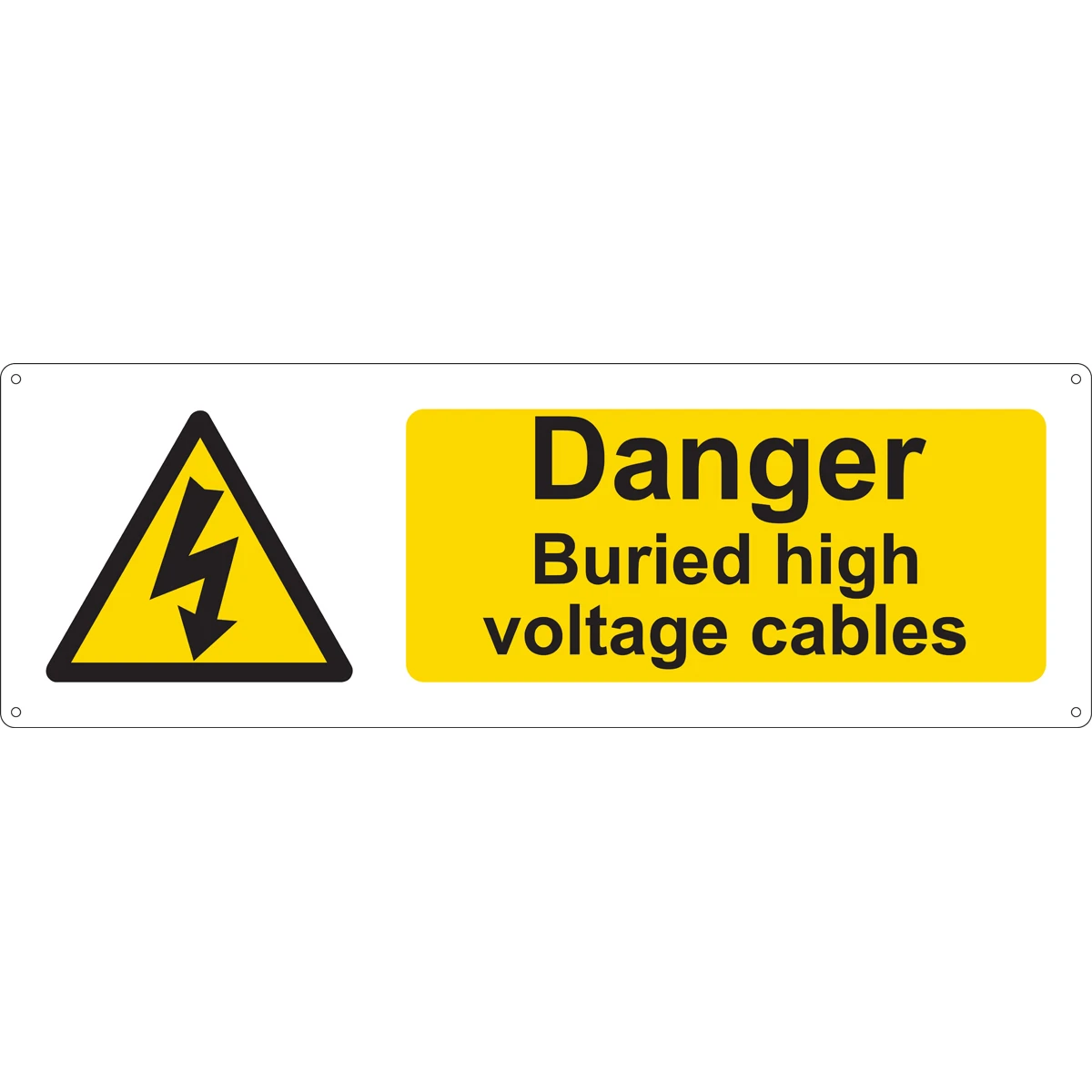 Health and safety sign with “Danger buried high voltage cables” written in black on a yellow background which indicates a warning of a possible hazard. · · · Semi rigid sign · · Black font on a yellow background · · Warns people of the danger of buried high voltage cables. · · Helps to prevent accidents. · · The sign can help to deter people from digging or working in areas where there may be buried high voltage cables. · · The sign can help to create a more safe and healthy environment for everyone.