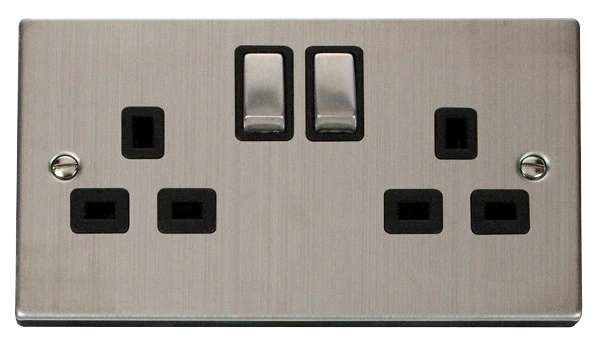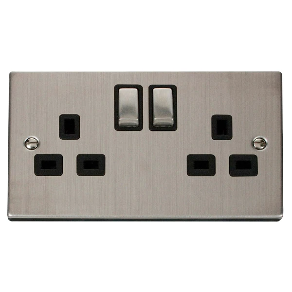Deco Switched Socket Ingot 2-Gang 2-Pole 13A 240VAC Black Insert Stainless Steel