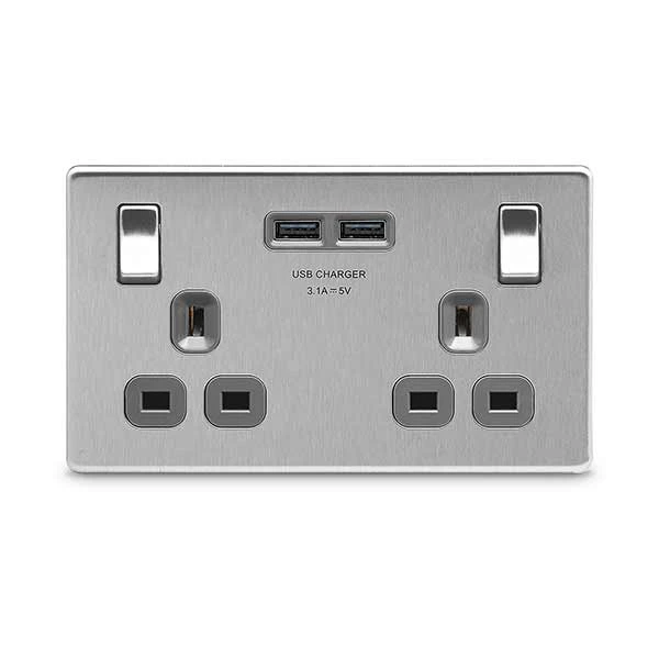 Decorative Brushed Steel 13A 2 Gang Socket + 2 x USB (3.1A) Grey Insert Switched Socket