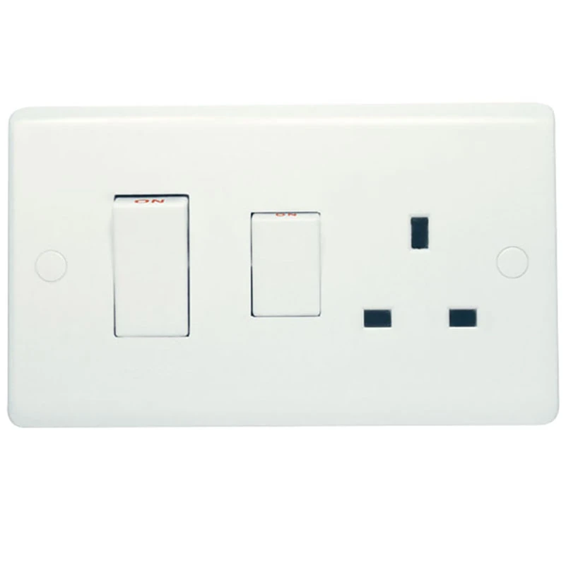 Stylish and slim with rounded corners this 45A Double Pole Switched Cooker Control Unit c/w 13A socket from the Designa Curve accessory range combining the latest modern design techniques together with reliability, value and outstanding quality. End users want invisible accessories, which is why we chose a soft neutral white finish that is uniform through out the range, is easy to wipe clean and has discreet matching screw caps. · · · Slim 5.5mm raised curve profile design to suit any application · · Durable and long lasting backed by a 25 year guarantee · · Tested and certified by ASTA:BEAB, Intertek and HKSTC · · Designed to fit UK standard 2 Gang accessory boxes · · Supplied with M3.5x25mm fixing screws · · Clearly marked terminals for ease of identification · · Switches have a positve yet easy push mechanism · · Colour codes terminals and backed out and captivated screws for fast installation · · Double pole switch to isolate appliances safely