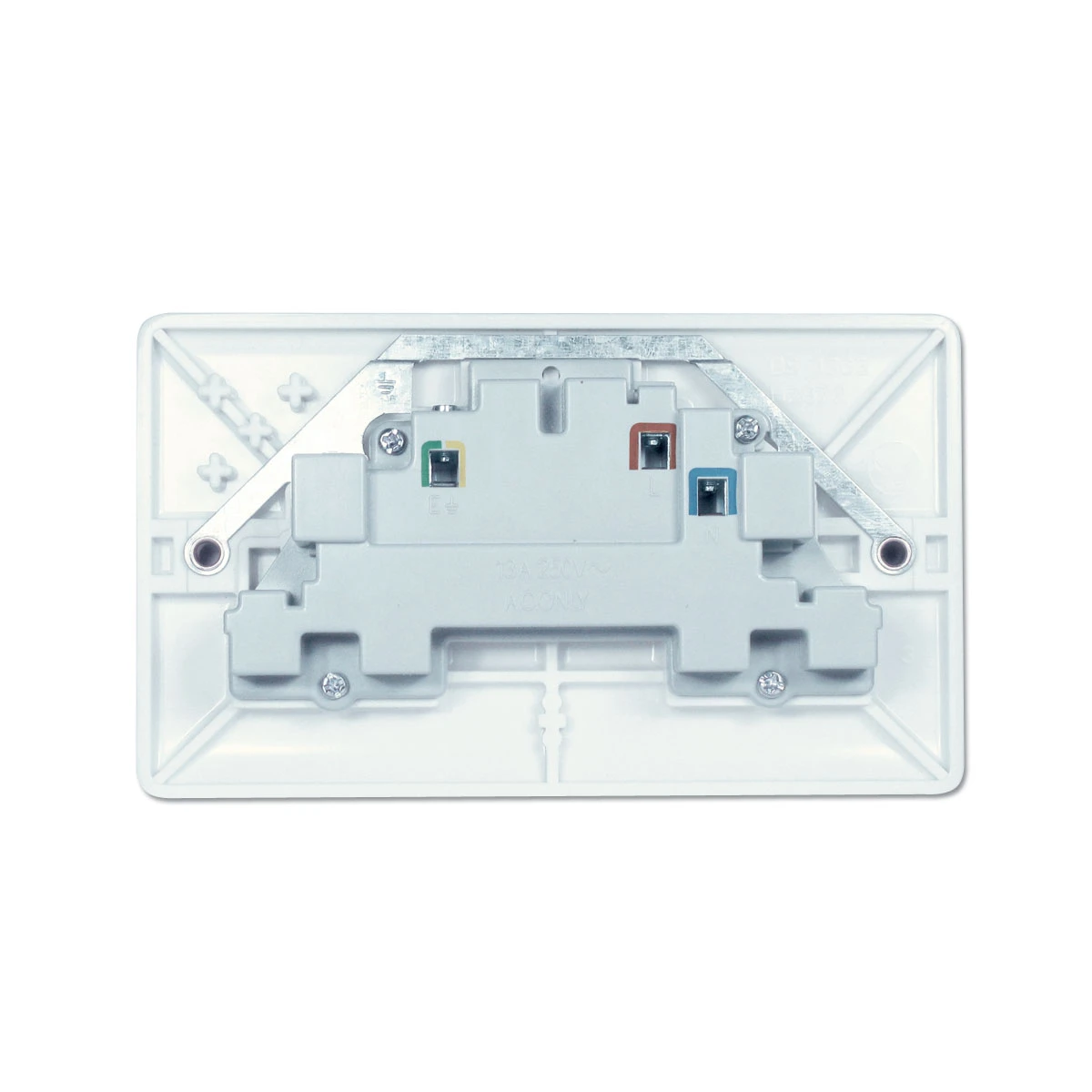 Stylish and slim with rounded corners this 2 Gang 13A Single Pole Switched Single Socket is from the Designa Curve accessory range combining the latest modern design techniques together with reliability, value and outstanding quality. End users want invisible accessories, which is why we chose a soft neutral white finish that is uniform through out the range, is easy to wipe clean and has discreet matching screw caps. All of our sockets are manufactured to British Standards whereby a shutter mechanism isolates the use of power unless a british 3 pin plug is inserted. Our switched sockets have rockers that are easy yet positive to operate and spaced far enough apart to prevent users switching two circuits at the same time. · · · Slim 5.5mm raised curve profile design to suit any application · · Durable and long lasting backed by a 25 year guarantee · · Tested and certified by ASTA:BEAB, Intertek and HKSTC · · Designed to fit UK standard 2 Gang accessory boxes · · Supplied with M3.5x25mm fixing screws · · Colour codes terminals and backed out and captivated screws for fast installation · · Engraved ON indicator on switch · · Positve feel switches · · Clearly marked terminals for ease of identification · · Maximum wiring capacity 3 x 2.5mm cable or 2 x 4mm cable
