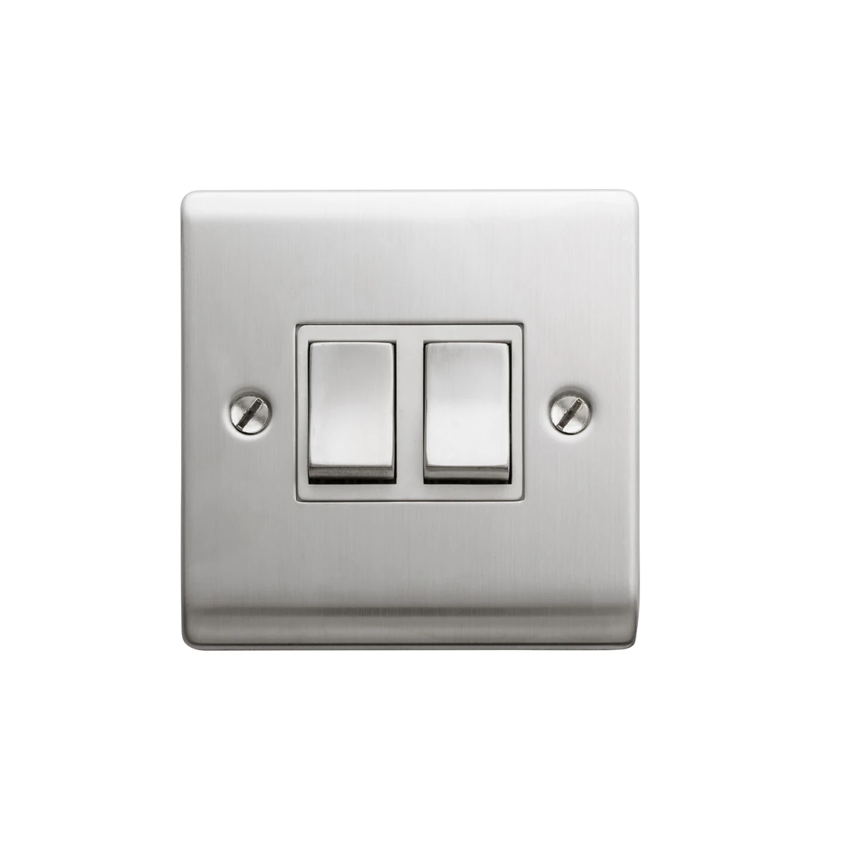 A high quality stylish and slim 2 Gang 2 Way 10AX Plate Switch Satin Steel With White Insert. Our extensive range of wall light switches are all 10AX rated as standard ensuring that they are suitable for commercial as well as domestic applications. The Curve decorative range offers an affordable decorative range at outstanding value, coming in four stunning finishes; satin steel, polished chrome, black nickel and graphite. · · · Slim 5.5mm raised curve profile design to suit any application · · High quality steel plated satin steel finish · · Tested and certified by ASTA:BEAB, Intertek and HKSTC · · Designed to fit UK standard 1 Gang accessory boxes · · Supplied with M3.5x25mm fixing screws · · Colour codes terminals and backed out and captivated screws for fast installation · · Clearly marked terminals for ease of identification · · Two way switches can be wired as one or two way · · Suitable for switching multiple circuits of lighting totalling no more than 1 amps · · Switch a range and combination of light sources such as halogen, cfl, incandescent and LED