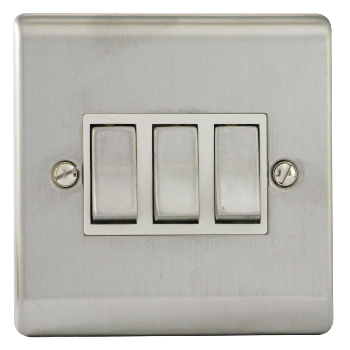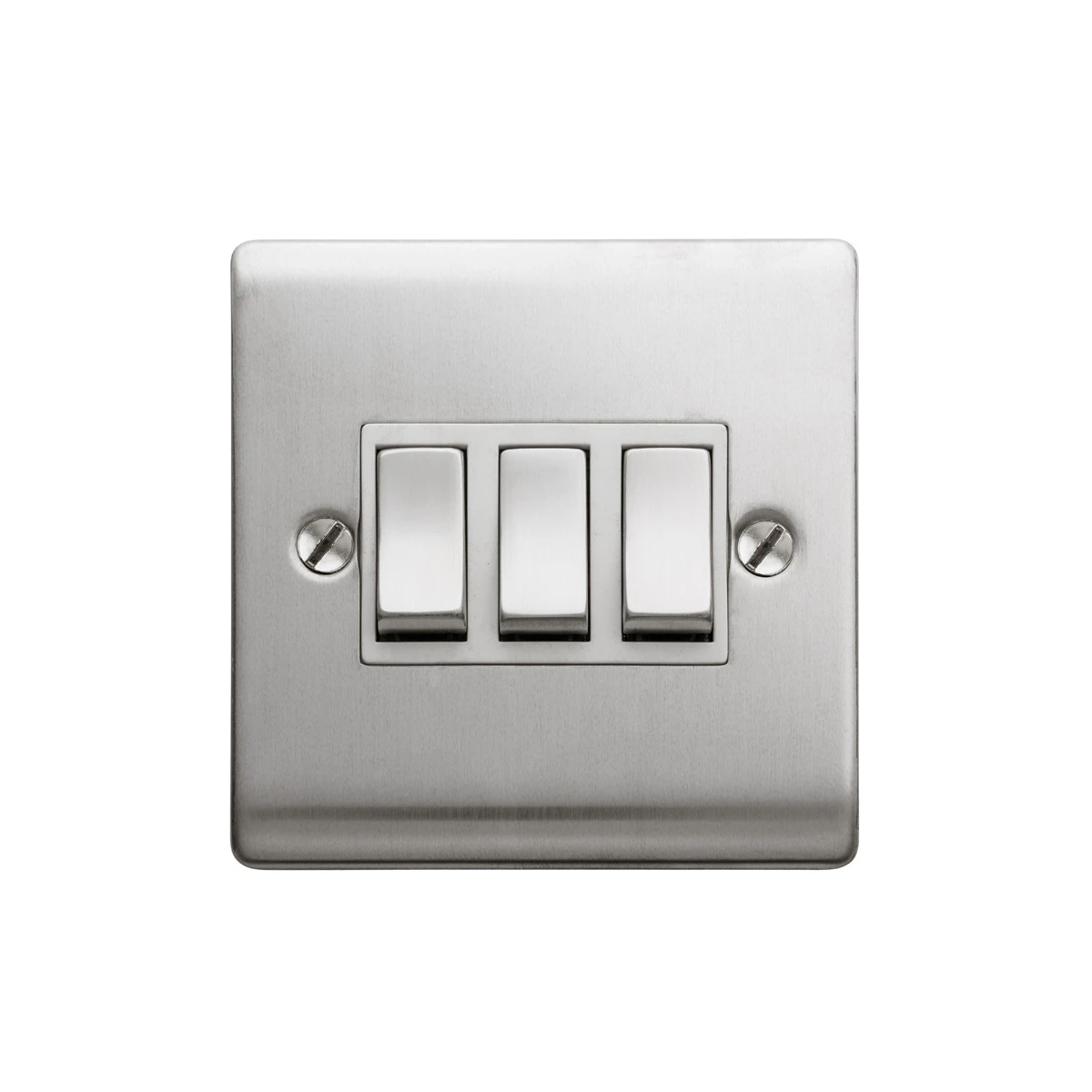 A high quality stylish and slim 3 Gang 2 Way 10AX Plate Switch Satin Steel With White Insert. Our extensive range of wall light switches are all 10AX rated as standard ensuring that they are suitable for commercial as well as domestic applications. The Curve decorative range offers an affordable decorative range at outstanding value, coming in four stunning finishes; satin steel, polished chrome, black nickel and graphite. · · · Slim 5.5mm raised curve profile design to suit any application · · High quality steel plated satin steel finish · · Tested and certified by ASTA:BEAB, Intertek and HKSTC · · Designed to fit UK standard 1 Gang accessory boxes · · Supplied with M3.5x25mm fixing screws · · Colour codes terminals and backed out and captivated screws for fast installation · · Clearly marked terminals for ease of identification · · Two way switches can be wired as one or two way · · Suitable for switching multiple circuits of lighting totalling no more than 1 amps · · Switch a range and combination of light sources such as halogen, cfl, incandescent and LED