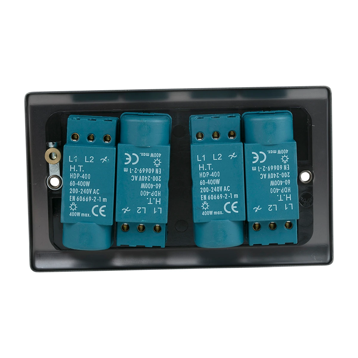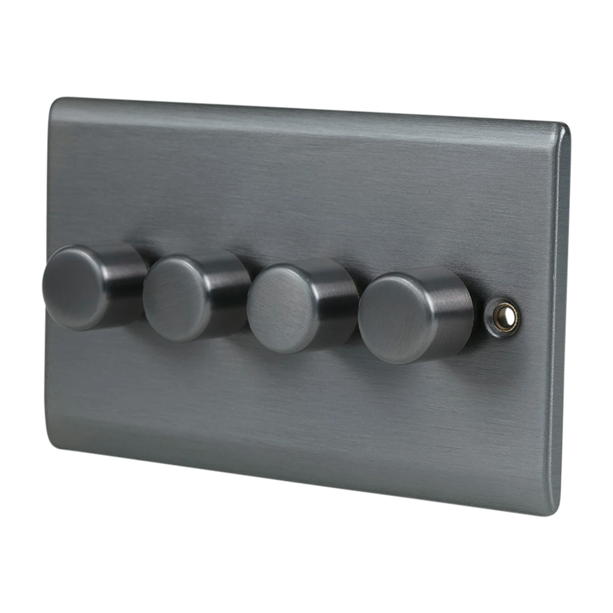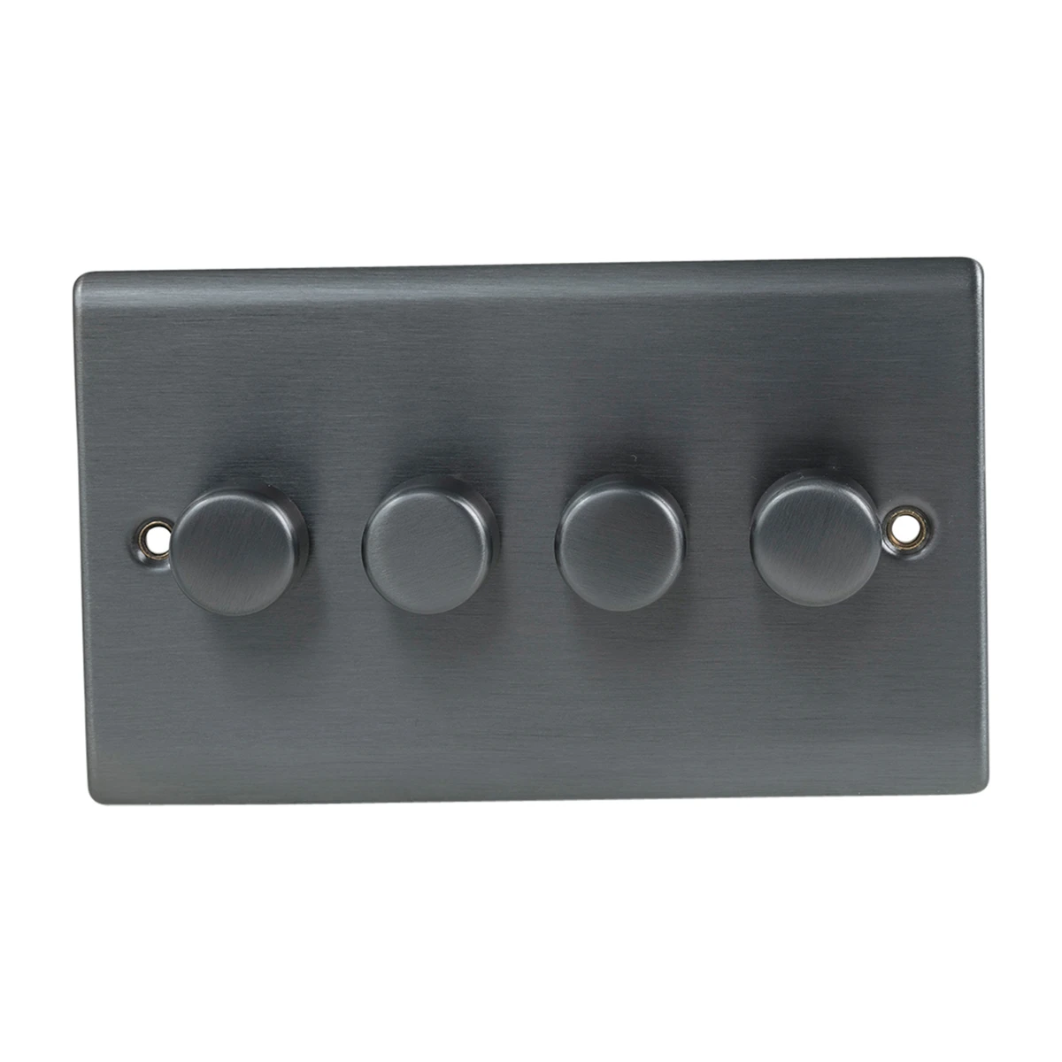 A high quality stylish and slim 4 Gang 2 Way 400W Push Dimmer Switch in graphite with colour matching screws. The controls are positive with just a gentle push and turn control that memorises the dimmer position when the knob is pushed to off and back to on again. The Curve decorative range offers an affordable decorative range at outstanding value, coming in four stunning finishes; satin steel, polished chrome, black nickel and graphite. · · · Slim 5.5mm raised curve profile design to suit any application · · High quality steel plated graphite finish · · Tested and certified by ASTA:BEAB, Intertek and HKSTC · · Designed to fit UK standard 2 Gang accessory boxes · · Supplied with M3.5x25mm fixing screws · · Hidden fixing screws to give a modern elegant apperance · · Supplied with colour matching screws · · The control memorises the dimmer position when the knob is pushed to off and back to on again · · Inductive loads – de-rate by 2% (when dimming LV resistive loads, transformers must always be suitable for dimming) · · Suitable for Mains & Low Voltage Lighting