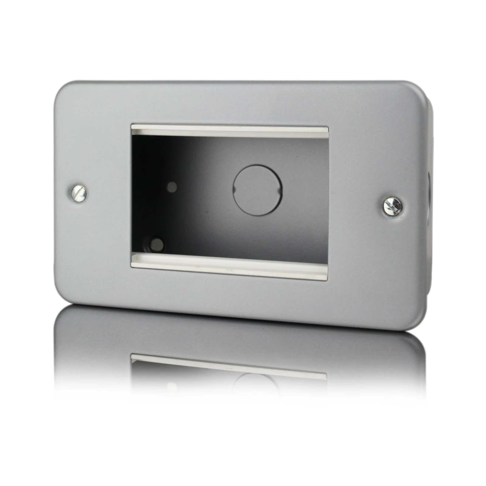 3 Gang metalclad gridswitch box for use with Designa gridswitch module plates · · · Tough and impact resistant grey metal clad wiring accesory · · 20mm knockout top, bottom and sides · · For use with Designa grid modules · · IP20 rated for indoor use