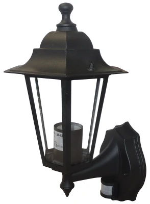 · · Outdoor lantern for a range of residential applications · · Die cast aluminium body with clear glass diffuser, suitable for non-coastal regions · · Incorporates fully adjustable PIR with lux, time (approx. 10 secs to 7 minutes) and sensitivity settings with a range of up to 8m x 120° · · Supplied without lamp · · E27 lampholder · · Maximum lighting load 60W · · Supplied with fixing screws and wall plugs · · IP44 rating for protection from solid objects larger than 1mm and splashes of water from any direction · · BS EN 60598-1 · · 2-year guarantee (excl. lamp)