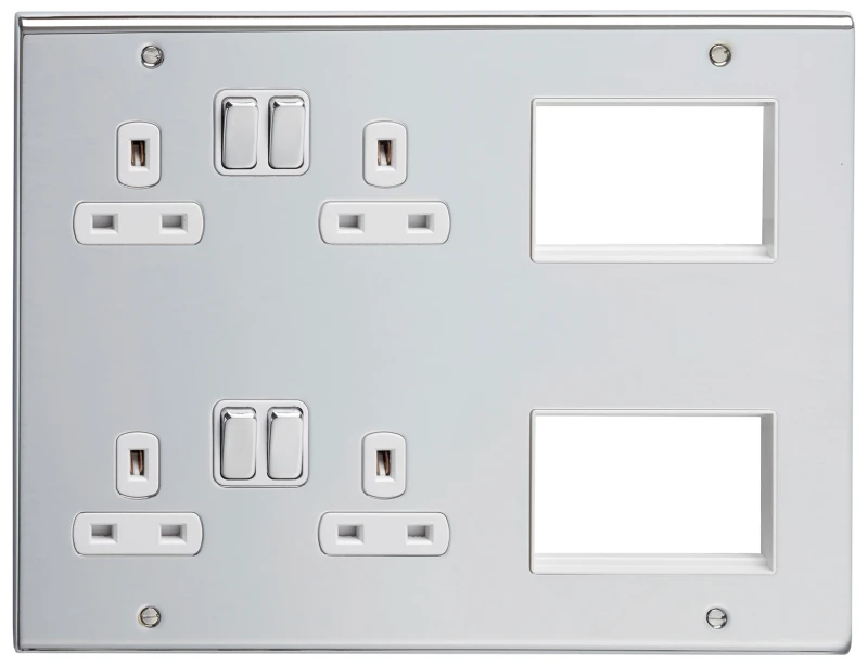 Deta Media Plate 2X2 Gang Switched Sockets 13A Chrome 2X3 Module Cutouts&Whi