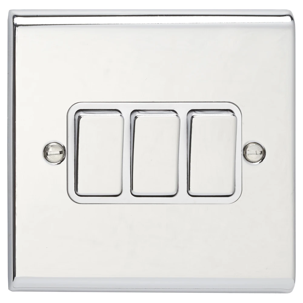 Deta Plate Switch 3 Gang 2 Way 10A Chrome White Insert